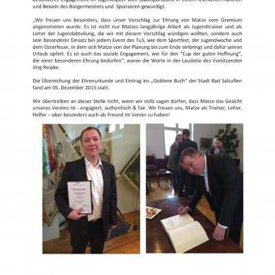Mit einer Einladung und Ehrung im „Historischen Rathaus“ wurde unser Matze für sein besonderes Engagement im Jugendsport vom Stadtsportbund in einem feierlichen Rahmen und Beisein des Bürgermeisters und Sponsoren gewürdigt.