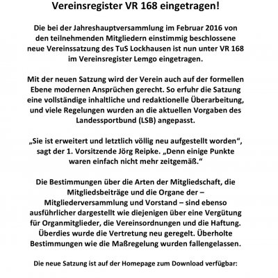 Neue Vereinssatzung amtlich im Vereinsregister VR 168 eingetragen!